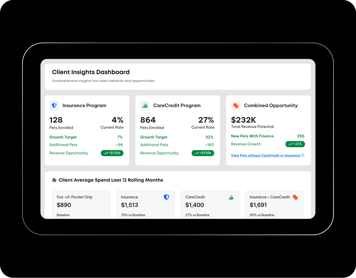 Explore consolidated group-level performance and financial impact of pet insurance and cost-of-care financing programs.